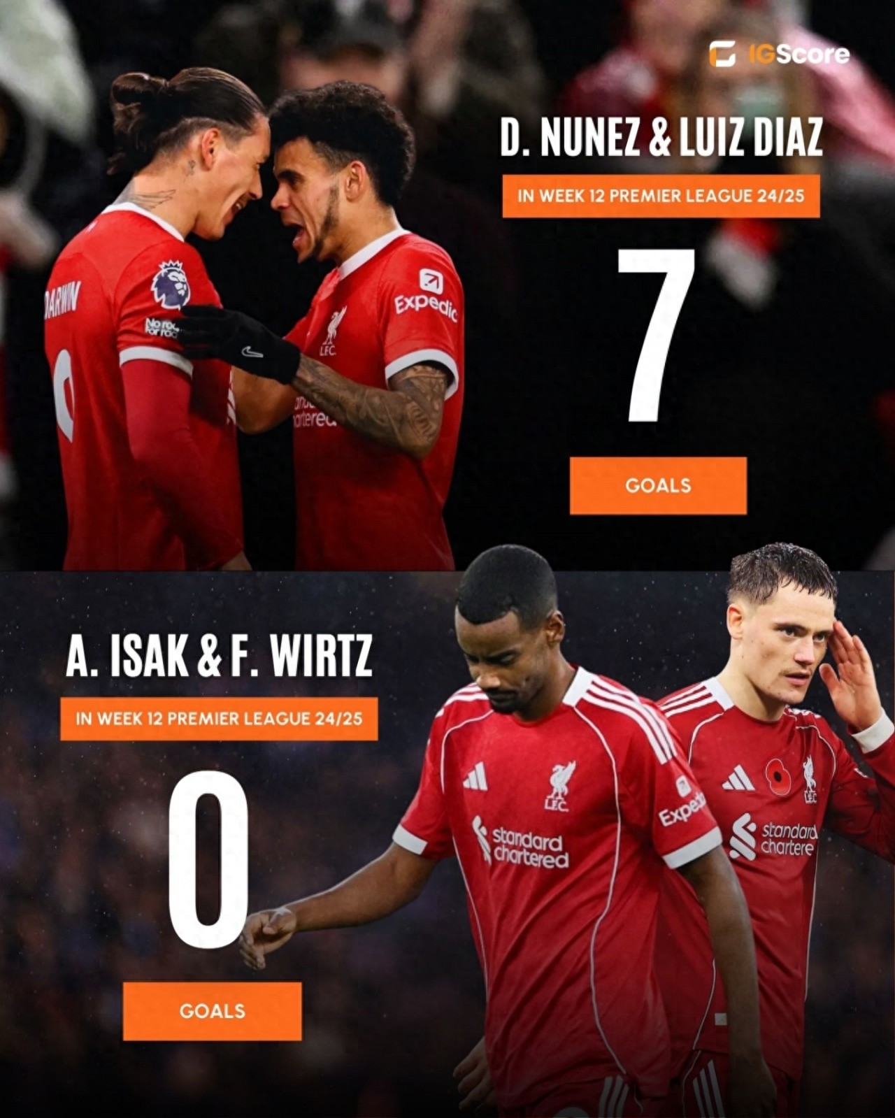 Liverpool có hai bản hợp đồng trị giá hơn 100 triệu euro vào mùa hè này, đó là Isaac với giá 145 triệu euro và Wirtz với giá 125 triệu euro. Kết quả là sau 12 vòng đấu ở Premier League, cả Isaac và Wirtz đều không có kết quả và đều ghi 0 bàn ở Premier League.