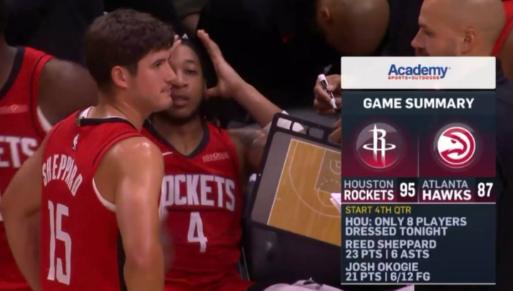 Trong trận đấu cuối cùng của giai đoạn tiền mùa giải, Rockets đã cho Durant, Shen Jing và những người chơi khác nghỉ ngơi rất nhiều. Trong hiệp đầu tiên, Rockets đã dẫn trước Hawks 31-27 với 4 điểm. Okogie ghi được 10 điểm và 2 lần cướp bóng trong 5 phút đầu tiên. Sau đó, Shepard cung cấp hỏa lực, liên tiếp tung ra những cú sút tầm trung và ghi ba bàn vào lưới hàng thủ.